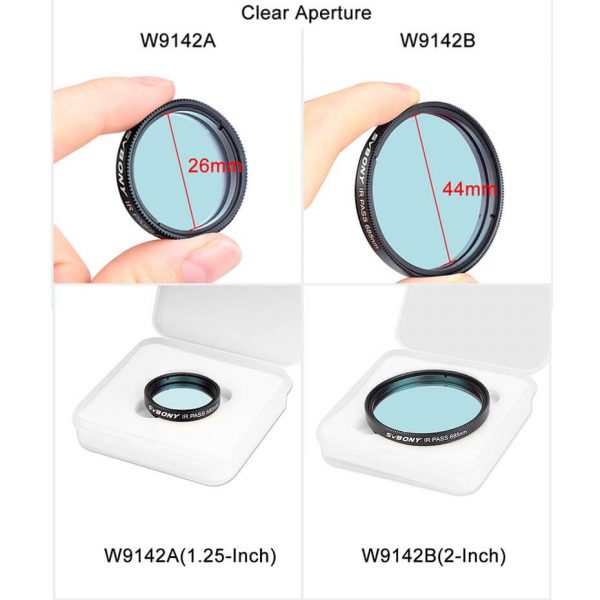 Kính lọc Svbony SV183 1,25″ là một chiếc kính lọc có tác dụng chặn các bước sóng dưới 670nm để nâng cao chi tiết tương phản và bề mặt và giảm ảnh hưởng của ánh sáng cường độ mạnh khi quan sát mặt trăng và hành tinh.
