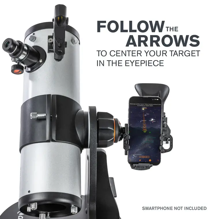 - Ngàm định vị bằng tay với khả năng điều chỉnh chuyển động chậm theo độ cao với một thanh trượt giúp bạn dễ dàng đi theo các mũi tên trên màn hình đến mục tiêu mong muốn. Khi tâm ngắm chuyển sang màu xanh lục, nó đã sẵn sàng để xem trên thị kính của kính thiên văn.