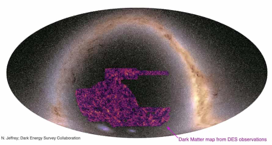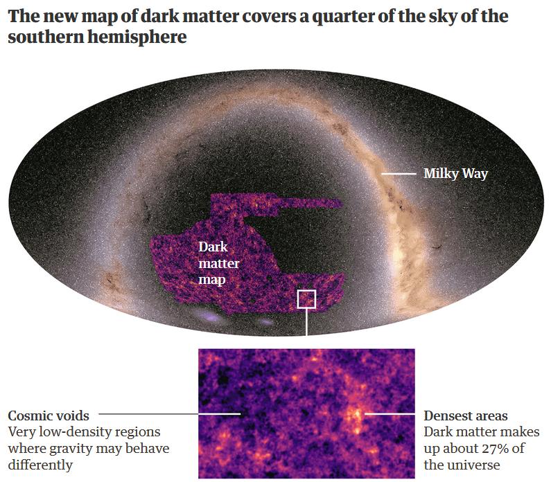 sáng có vật chất chắn phía trước và bẻ cong chùm sáng này. Sử dụng các thuật toán trí tuệ nhân tạo để phân tích hình ảnh của 100 thiên hà, các thành viên của nhóm Khảo sát Năng lượng tối quốc tế (DES) – một nỗ lực hợp tác nhằm khám phá bản chất của năng lượng tối bí ẩn đang thúc đẩy sự giãn nở của vụ trụ – đã xây dựng nên một bản đồ che phủ một phần tư bầu trời Nam bán cầu (tức một phần tám toàn bộ bầu trời nhìn từ Trái Đất).
